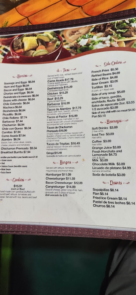 Breakfast and Brunch Options: These include dishes such as Machaca Breakfast, Egg Sausage Potato Burrito Smothered with Red Chili, Chilaquiles with various sauces (tomatillo, red, mole, verde), and Chicken Soup. These options are suitable for morning or midday meals.